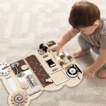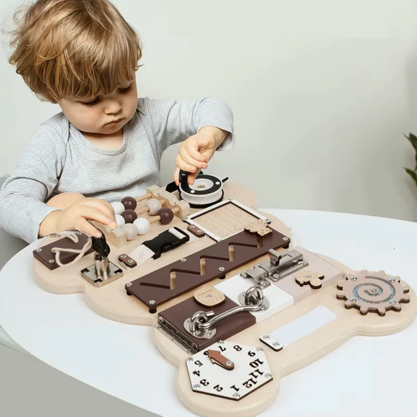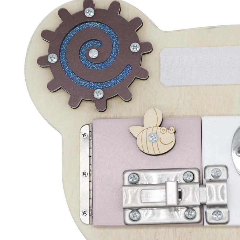 Детска дървена дъска Монтесори-мече от GINGER HOME е вдъхновена от Монтесори педагогиката интерактивна играчка, която съчетава забавление и обучение. Създаден с мисъл за детското развитие, тази детска дървена дъска Монтесори-мече стимулира фината моторика, логическото мислене и координацията око-ръка, като превръща ученето в игра. Благодарение на множеството занимателни елементи – зъбни колела, катарами, ключалки, въртящи се части, часовник и сметало предлага безкрайни възможности за ролеви игри и занимания. Подходящи за деца от 1 до 4 години. Със своята форма на сладко мече и стилна комбинация от натурално дърво и кафяво, е не само полезен, но и естетично допълнение към детската стая. Леката и компактна конструкция го прави удобен за игра у дома, в детската градина или по време на пътуване. Изработен е от висококачествени и безопасни материал – шперплат, MDF и метал – с гладки ръбове и нетоксично покритие, гарантиращи безопасност за малките ръчички.