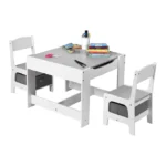 Детска Дървена Маса с 2 Столчета White/Grey на работния плот на масата осигуряват две различни функции. Използвайте сивата дъска за четене на книги, игра и черната дъска за писане и рисуване, за да развиете въображението на децата. Краката са проектирани да бъдат здрави и устойчиви на удар, което гарантира безопасността на вашето дете, дори когато седи неспокойно.