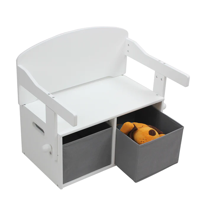 Детска Дървена Пейка Бюро и Органайзер – 3 в 1, който лесно се превръща от пейка с място за съхранение в стол и бюро.Перфектно оразмерена специално за деца, пейката предлага на малките многофункционална работна станция за игра, домашна работа, занаяти, хранене, като спестява място.