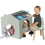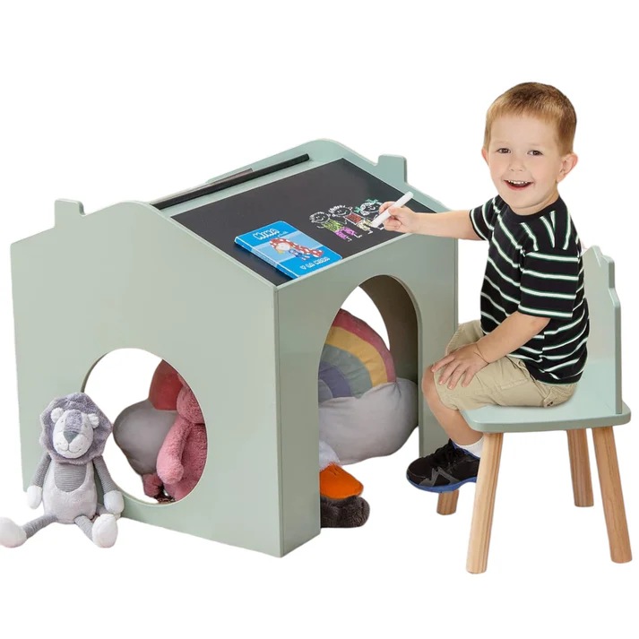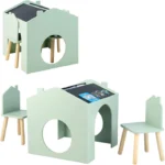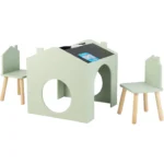 Детска масичка със столчета, черна дъска и плот за рисуване е създадена специално за деца този висококачествен комплект  има  безвредно покритие,  предпазва от надраскване и улеснява почистването . Детската маса има мултиактивна къщичка, която представлява черна дъска за писане и рисуване. Гладката повърхност отгоре на детската маса е удобна за рисуване, хранене и други занимания .Чудесен начин за оптимизиране на пространството е този комплект детска маса и столчета в бяло и сиво. Удобните рафтове за съхранение от двете страни на детската маса са практични за съхранение на книги или тетрадки .