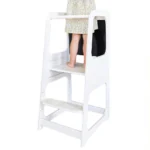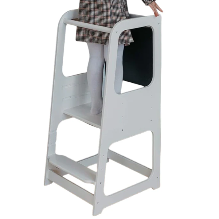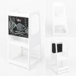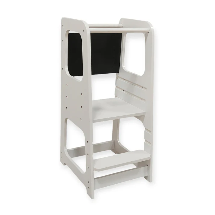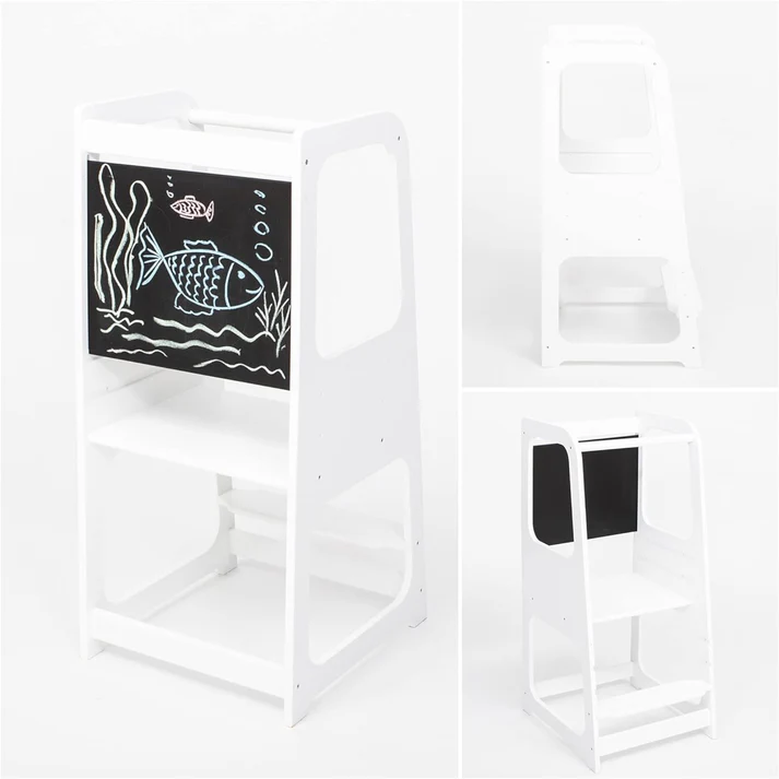 Детска регулируема кула с черна дъска с модерен и стабилен дизайн . Детска регулируема кула с черна дъска е изработена от висококачествени дървени материали, което гарантира нейната дълготрайност и стабилност. Със своя елегантен бял цвят и изчистени линии,  лесно се вписва във всяка детска стая, добавяйки нотка елегантност и ред. Регулируемата височина позволява лесно приспособяване към ръста на детето, осигурявайки комфорт и сигурност по време на използване. Кулата е снабдена с черна дъска, която предоставя възможност за рисуване и писане с тебешир, стимулирайки творческото мислене и учебните дейности на детето. Дизайнът на кулата е съобразен с принципите на Монтесори, насърчавайки децата да бъдат самостоятелни и да участват активно в различни дейности в домакинството. Това образователно столче стълба е идеално за ползване в кухнята, като позволява на децата да се включат в приготвянето на храна, миене на съдове и други домашни задачи, развивайки техните умения и увереност. Мебелите не са само функционални, но и израз на стил и естетика. Разнообразието от материали – от дърво и метал до текстил и кожа – предоставя възможности за подбор на мебели, които отговарят на предпочитанията и изискванията на всеки. Съчетаването на различни текстури, цветове и форми създава интересен и хармоничен интериор.