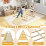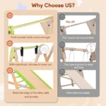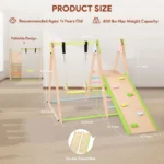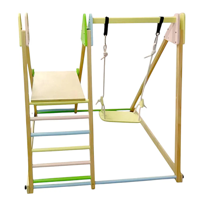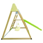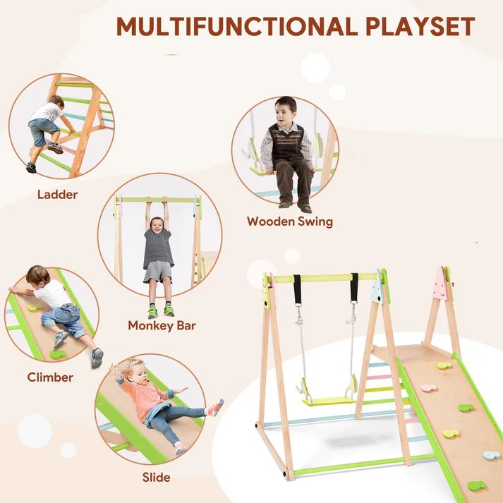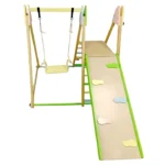 Детски дървен комплект GINGER HOME 4 в 1 , е  допълнение към вашата градина, което ще насърчи децата ви да играят навън. Детски дървен комплект GINGER HOME 4 в 1  се сглобява лесно с включените монтажни материали. Включва люлка, пързалка, катерушка и рампа за катерене, изработени от безопасни и висококачествени дървени материали. Идеален както за вътрешни пространства, така и за игра на открито на свеж въздух в хубаво време! Двустранната рампа предлага гладка повърхност за пързаляне и цветни катерачни камъни за допълнително забавление. Този градински комплект GINGER HOME e изработен от масивно дърво обработено БЕЗ олово и BPA според стандарта.  Създаден да издържи дълго, идеален за всяка градина, морава, двор, заден двор, или външна зона за игра. Градинският комплект  е подходящ за деца над 3 годишна възраст и е тестван за безопасност, здравина и стабилност и отговаря на всички европейски стандарти. Вдъхновен от принципите на Монтесори, този комплект насърчава самостоятелната игра и физическото развитие.  Специално обработена дървесина, устойчива на дъжд и слънце, гарантираща дълготрайност. Изработена от масивно дърво + шперплат, която осигурява стабилност и дълъг живот на продукта.