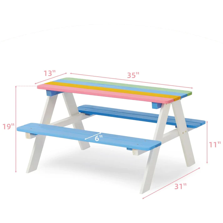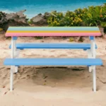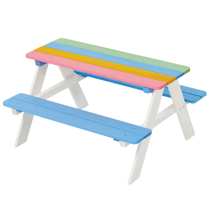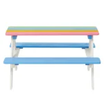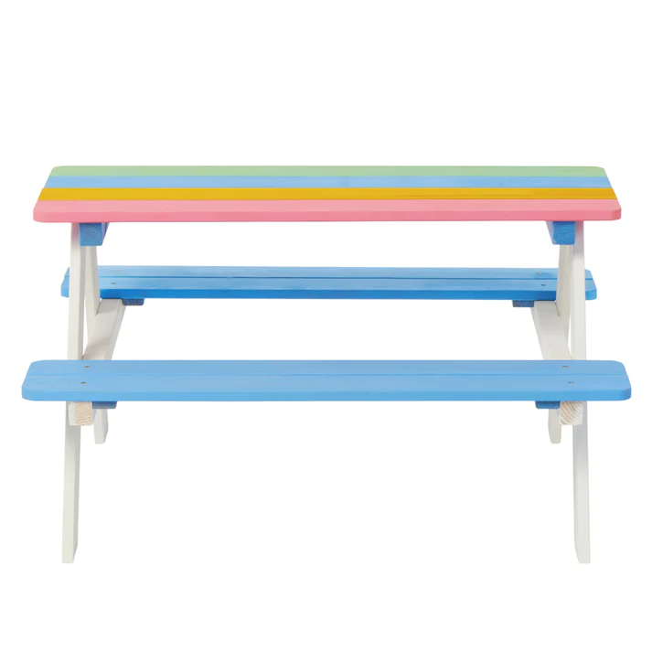 Детски комплект-маса с пейки RAINBOW, подходящ за употреба на открито и на закрито, с атрактивен многоцветен дизайн. Детски комплект-маса с пейки RAINBOW може да се използва както в градината, двора, балкона, така и вътре в детската стая.  Погрижете се малките да са щастливи и ангажирани с часове, докато прекарват времето си на открито. Превърнете градината в зона за игра, където малките се забавляват с приятели сред природата с детската маса за пикник. Насърчете креативността и осигурете условия за енергични игри на открито. Цветният градински комплект за деца си заслужава, независимо дали планирате проста актуализация на двора или цялостен редизайн. Използвайте тази маса за пикник за обяд, учене, време за игра. Местата за сядане са за до 4 деца. Градинският комплект е идеален за децата, да се настанят удобно за социални игри и взаимодействие, така ще растат здрави и щастливи.
