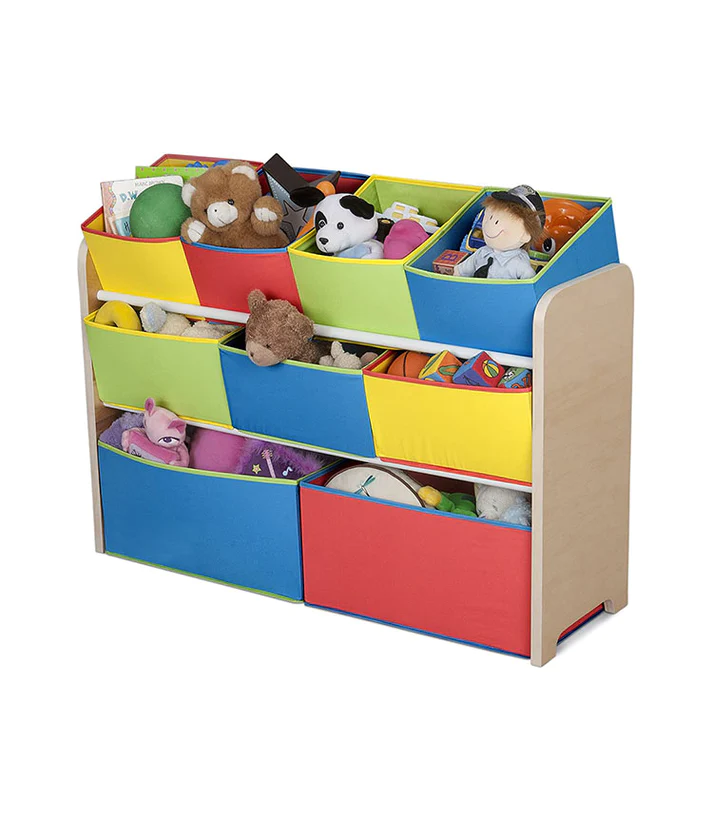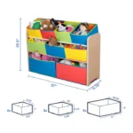 Детски Органайзер на 3 нива има 9 подвижни, текстилни кутии за съхранение с различни размери – идеални за книги, играчки и принадлежности за рисуване.